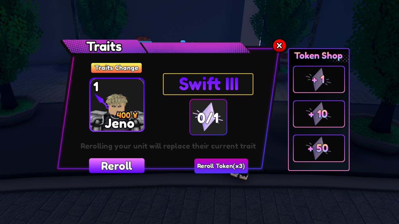 Особенности — это приросты характеристик, которые можно «выбить» для своих юнитов. Это делается с помощью NPC по имени Traits. Вы найдете её слева от лестницы, ведущей к зданию Эволюций. Для повторной попытки (reroll) вам потребуются Жетоны Переролла (Reroll Tokens). Необходимо поместить персонажа в специальное окно. Важно помнить: герой будет снят с вашей активной команды, так что не забудьте вернуть его обратно на поле боя!